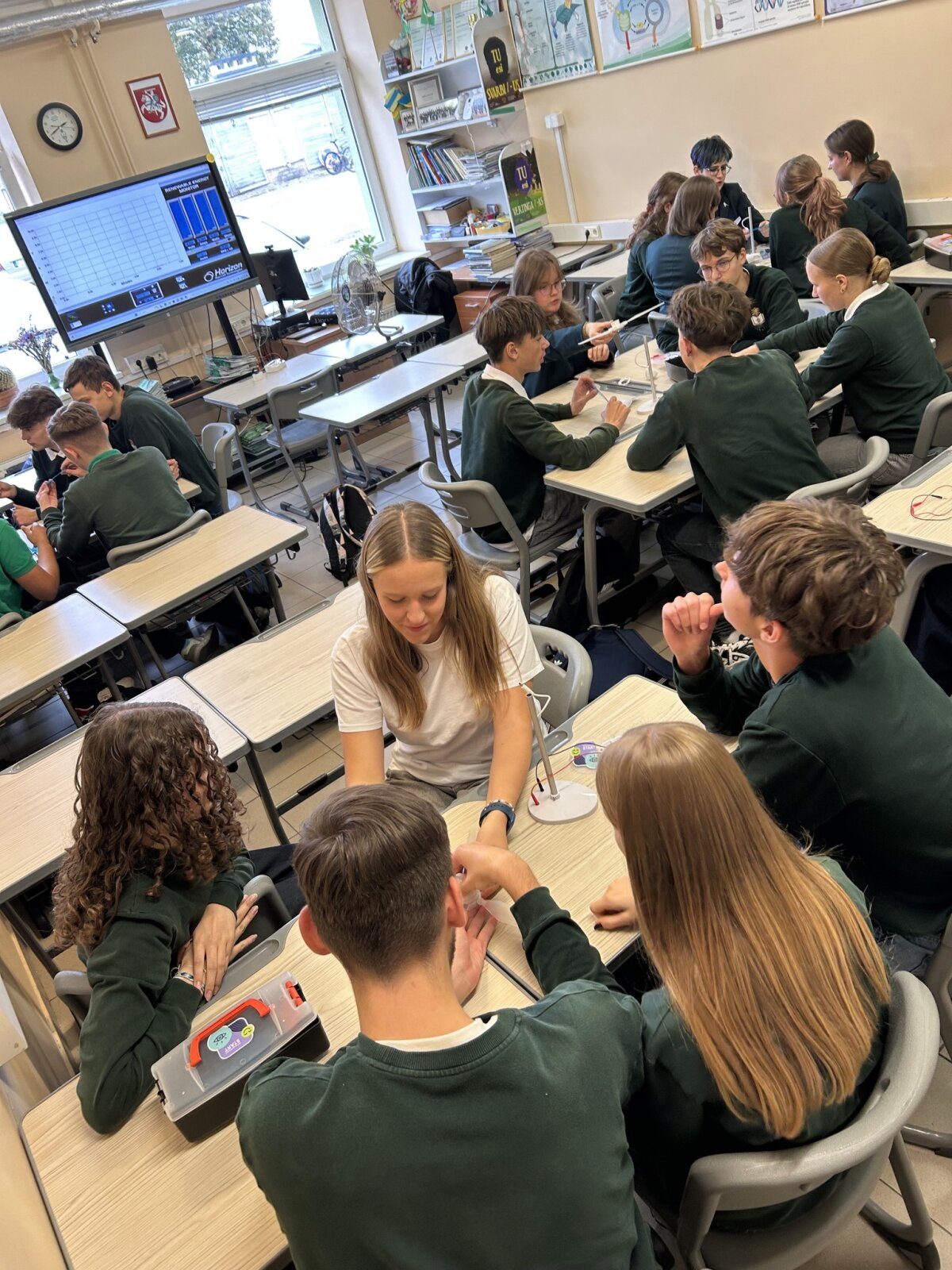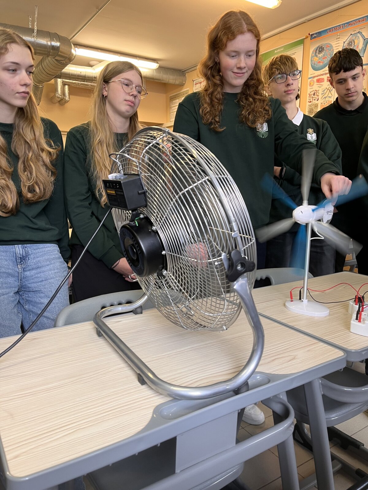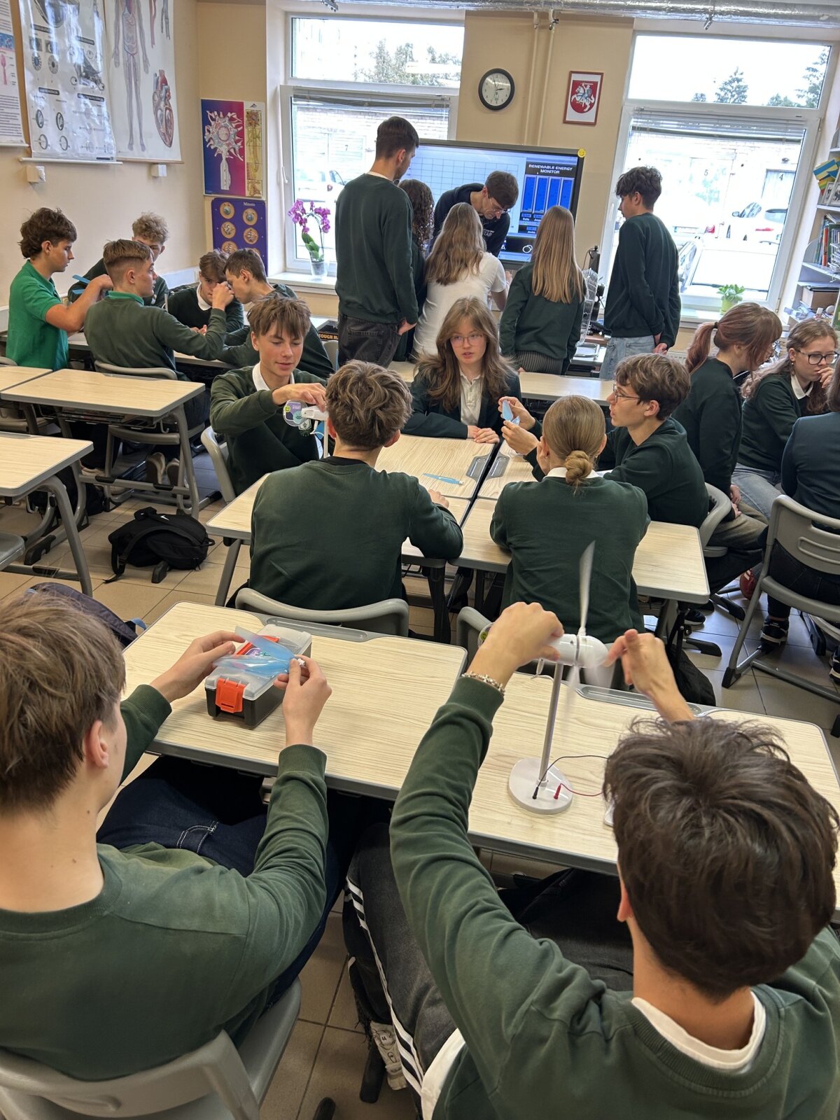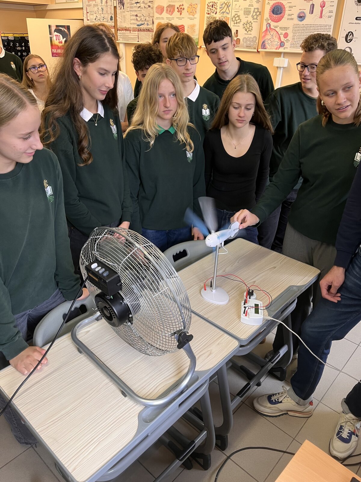 Švari energetika tampa būtina. Tarp svarbiausių sprendimų - saulės ir vėjo jėgainės. Ignitis grupės atstovas komunikacijos koordinatorius M.Tamošiūnas supažindino su Lietuvos planais šioje srityje ir pravedė praktinį užsiėmimą ID ir IID STEAM klasių gimnazistams. Mokiniai, dirbdami grupėmis, konstravo vėjo elektrinių modelius, kompiuterine įranga matavo generacijos galią. Įsitikino, kad ji priklauso nuo konstrukcinių sprendimų. Komandoms, kurių modeliai sukūrė didžiausią galią, koordinatorius įteikė dovanėles.