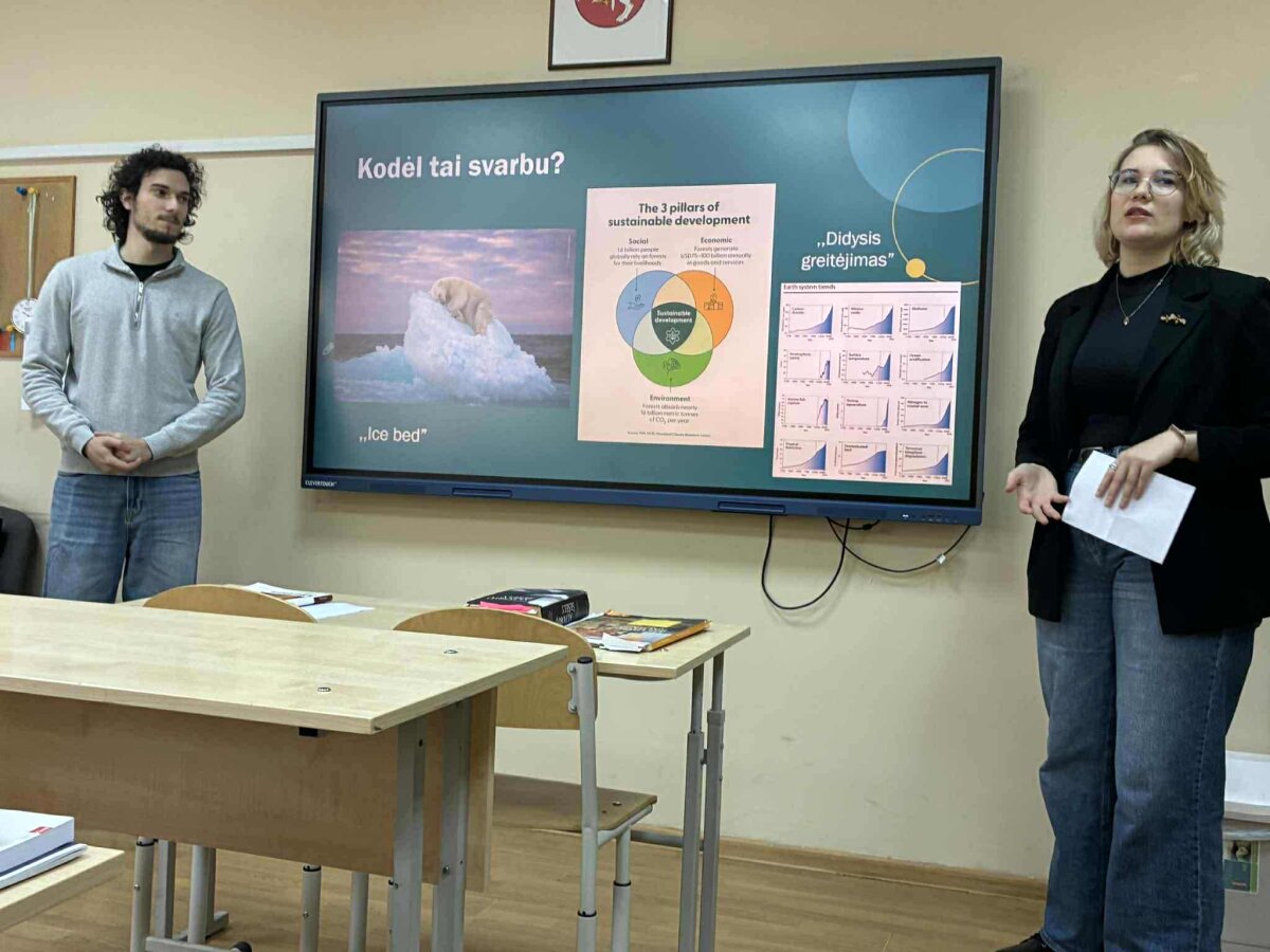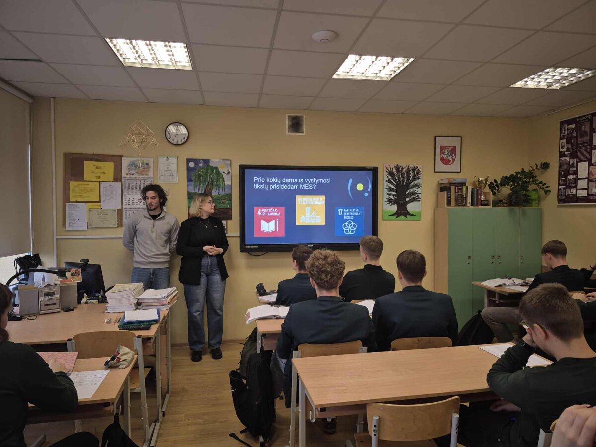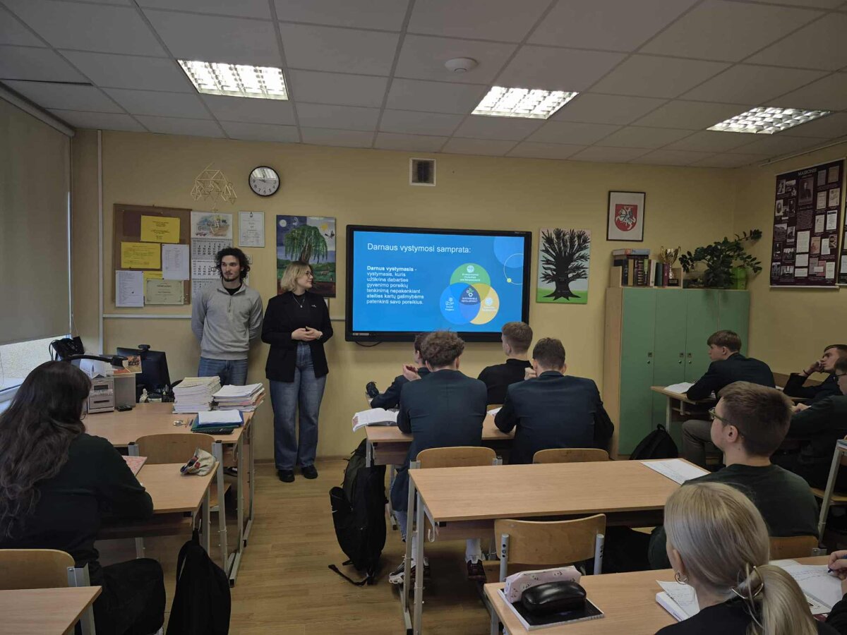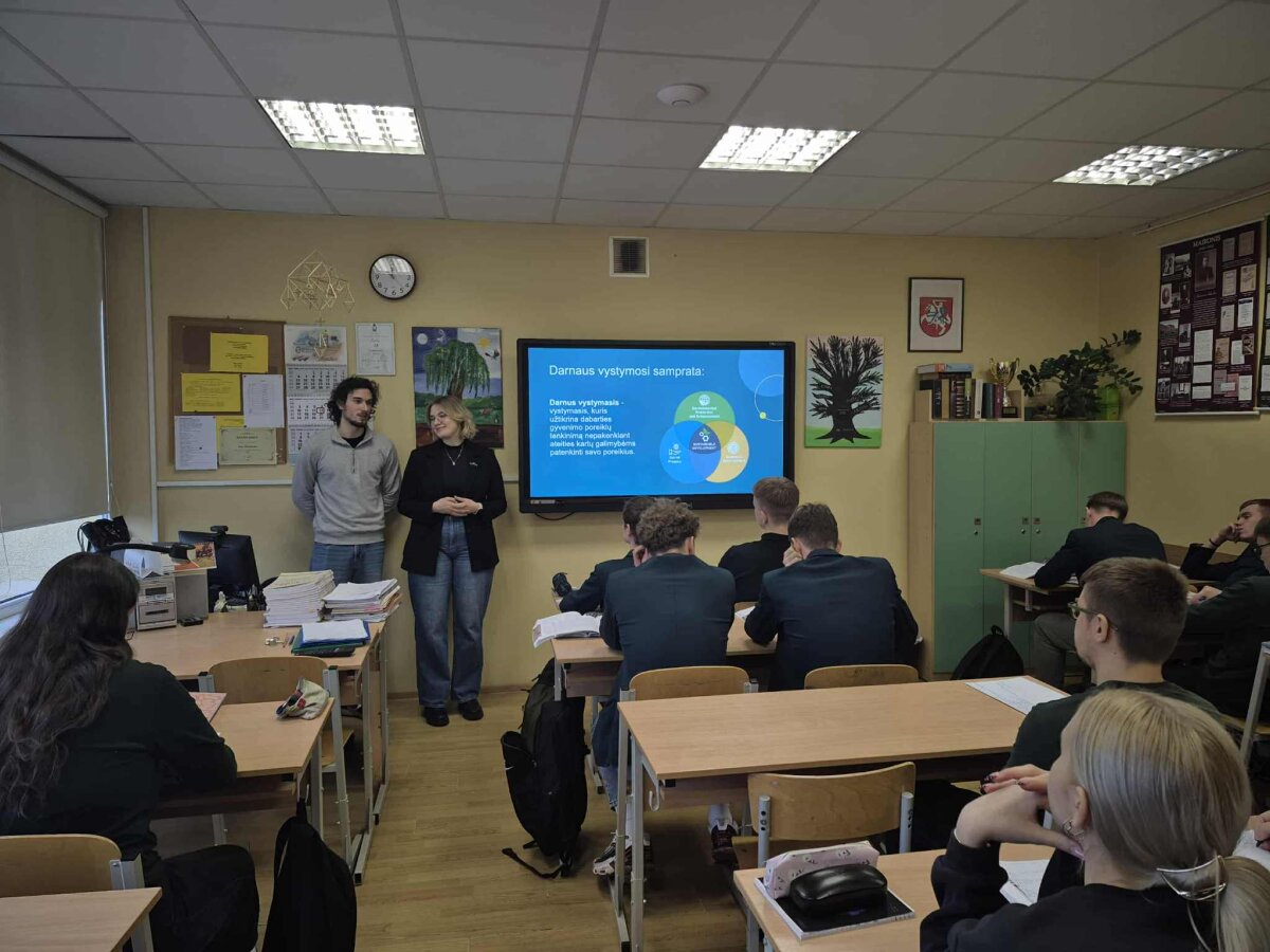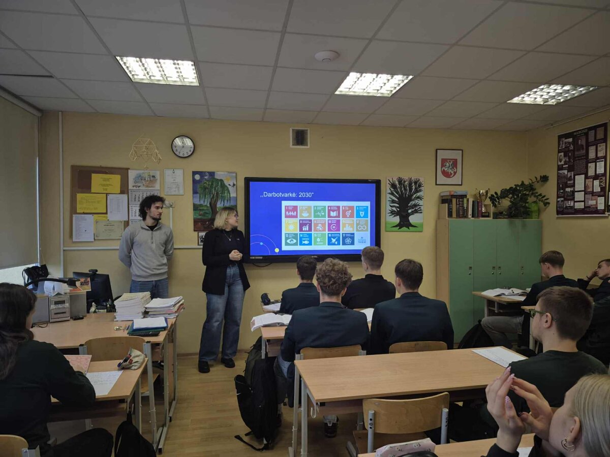Lapkričio 13d. gimnazijoje lankėsi alumnai Ervinas Gvazdaukas (gimnaziją baigė 2023 m.) ir Jomilė Striuogytė (gimnaziją baigė 2024 m.), kurie sėkmingai studijuoja Kauno technologijos universitete. Jie papasakojo mūsų gimnazistams apie darnaus vystymosi tikslus, šios darbotvarkės atsiradimo ištakas, surengė žaismingą apklausą, akcentavo kokybiško išsilavinimo svarbą. Nuostabu, kad buvusių mokinių ryšys su gimnazija nenutrūksta, kad jie sugrįžta turėdami kilnių tikslų ir norėdami praturtinti mūsų bendruomenės narius.