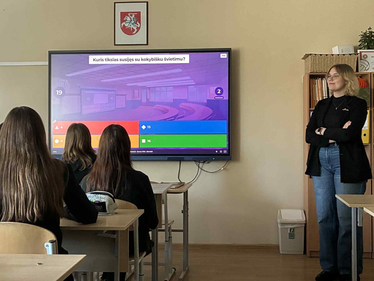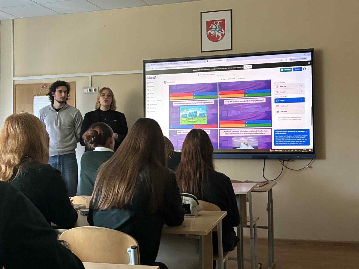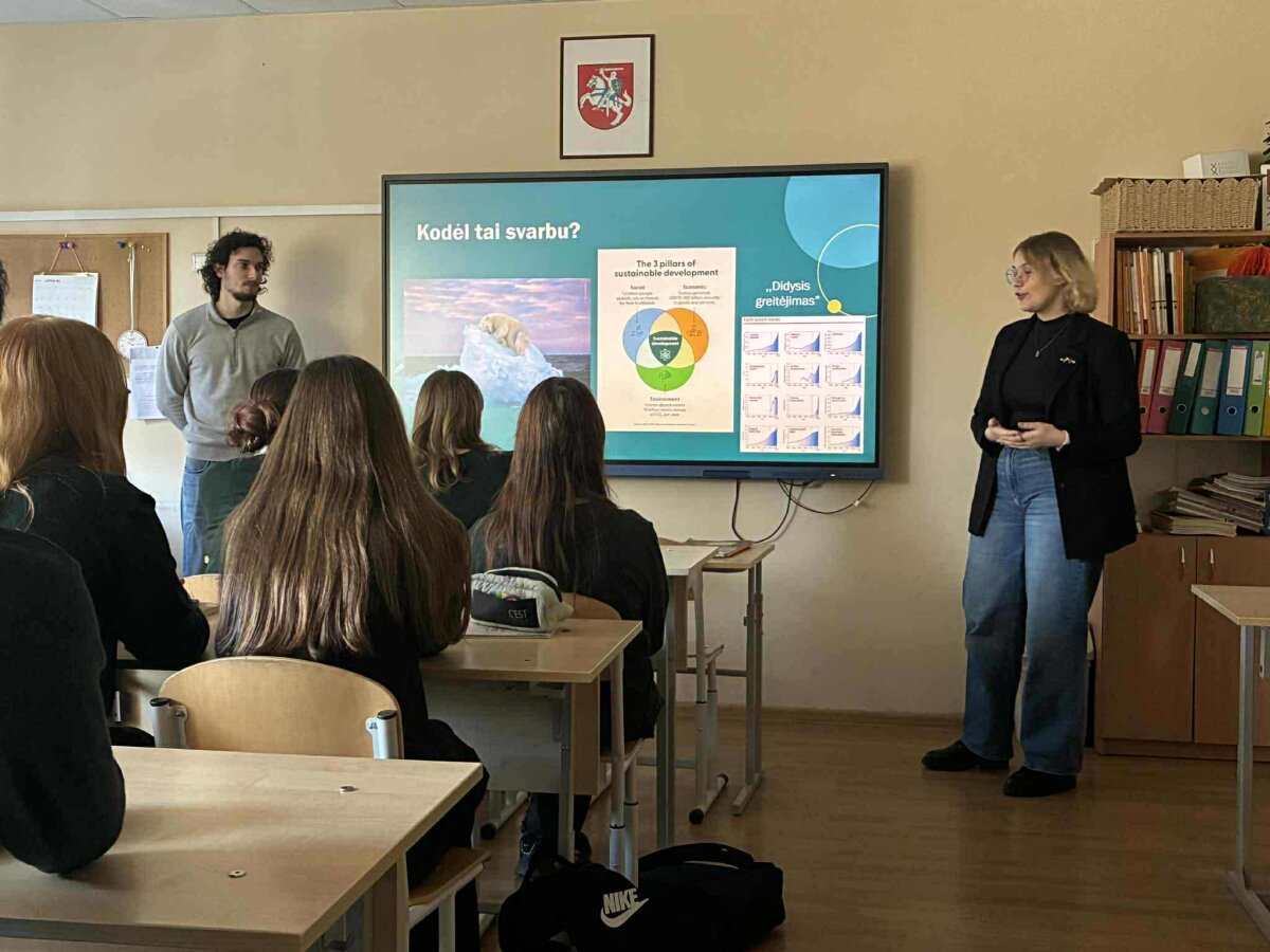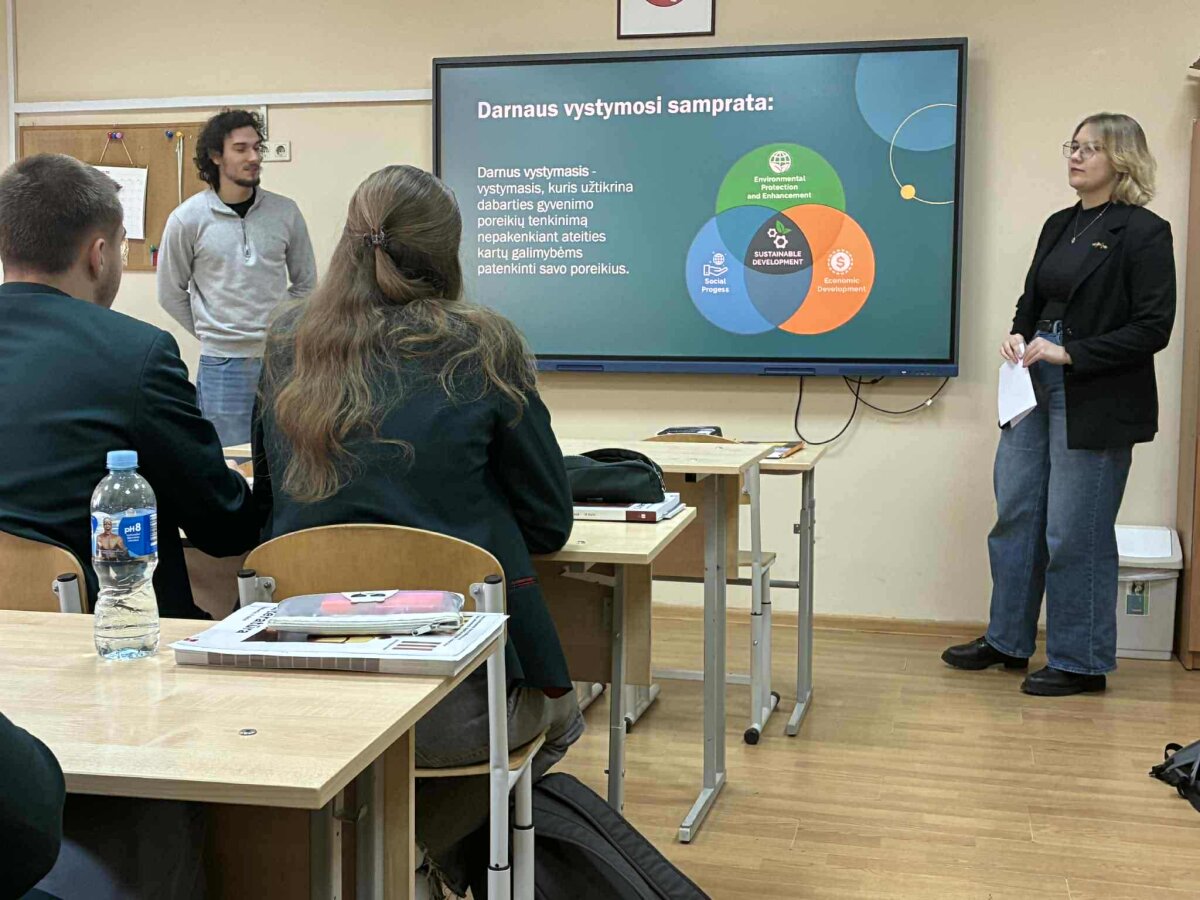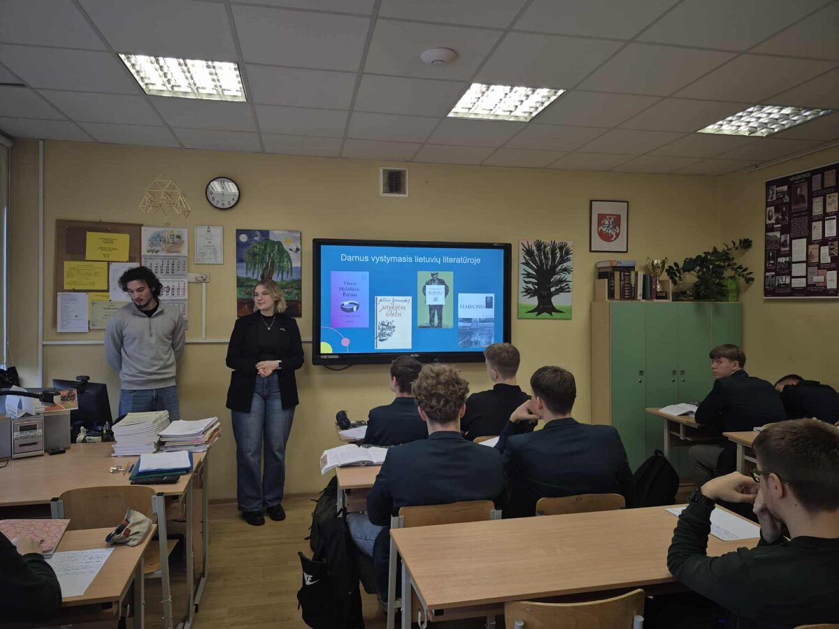 Lapkričio 13d. gimnazijoje lankėsi alumnai Ervinas Gvazdaukas (gimnaziją baigė 2023 m.) ir Jomilė Striuogytė (gimnaziją baigė 2024 m.), kurie sėkmingai studijuoja Kauno technologijos universitete. Jie papasakojo mūsų gimnazistams apie darnaus vystymosi tikslus, šios darbotvarkės atsiradimo ištakas, surengė žaismingą apklausą, akcentavo kokybiško išsilavinimo svarbą. Nuostabu, kad buvusių mokinių ryšys su gimnazija nenutrūksta, kad jie sugrįžta turėdami kilnių tikslų ir norėdami praturtinti mūsų bendruomenės narius.