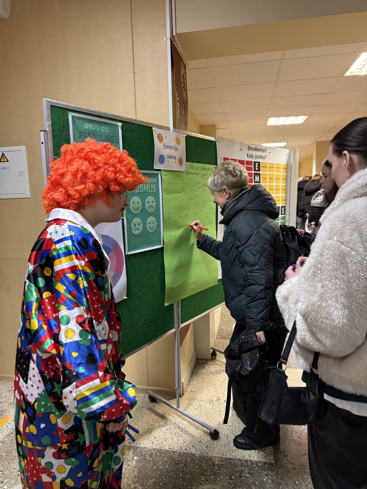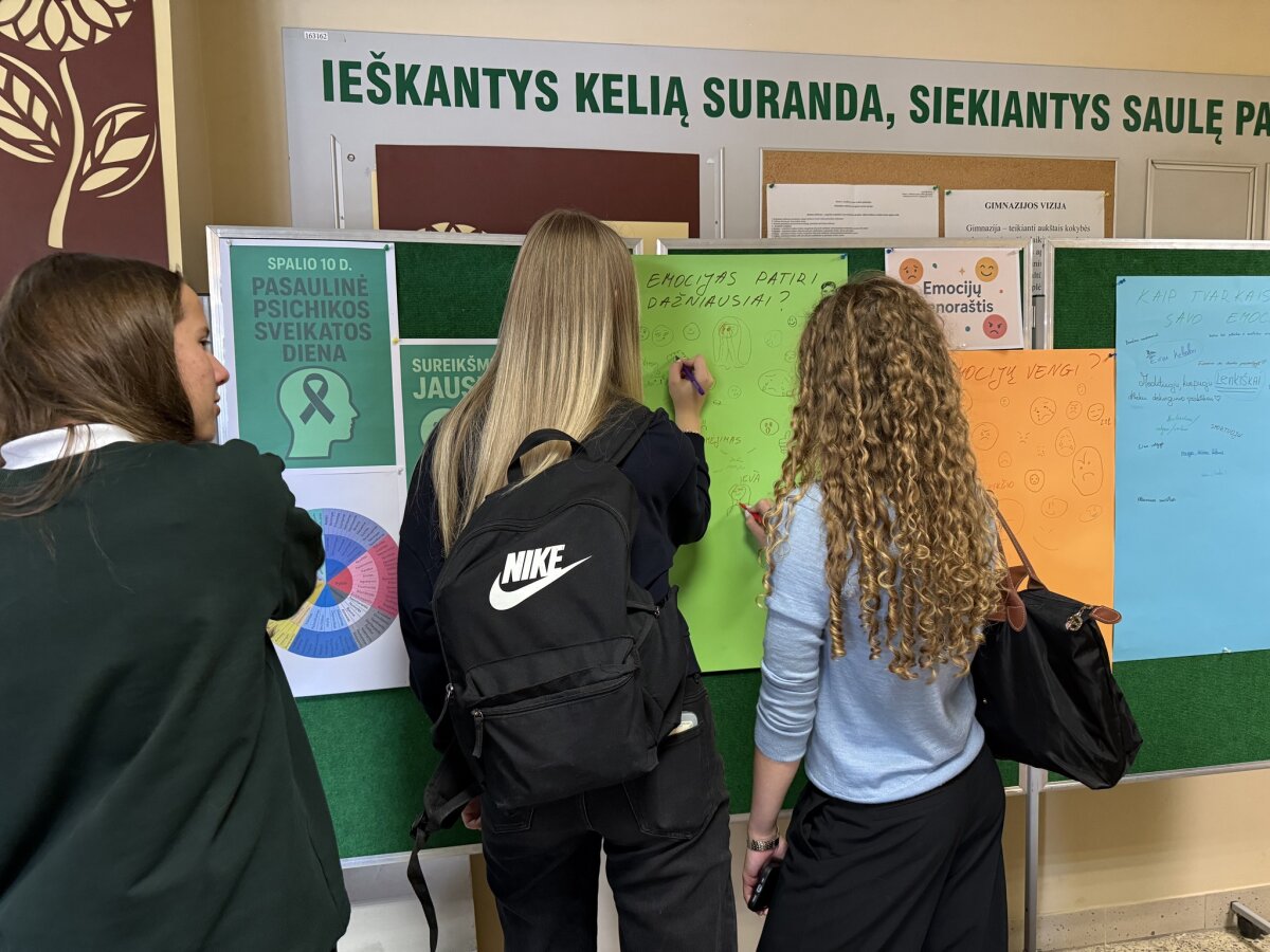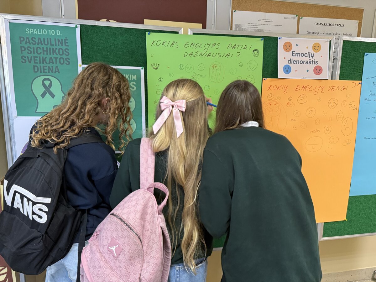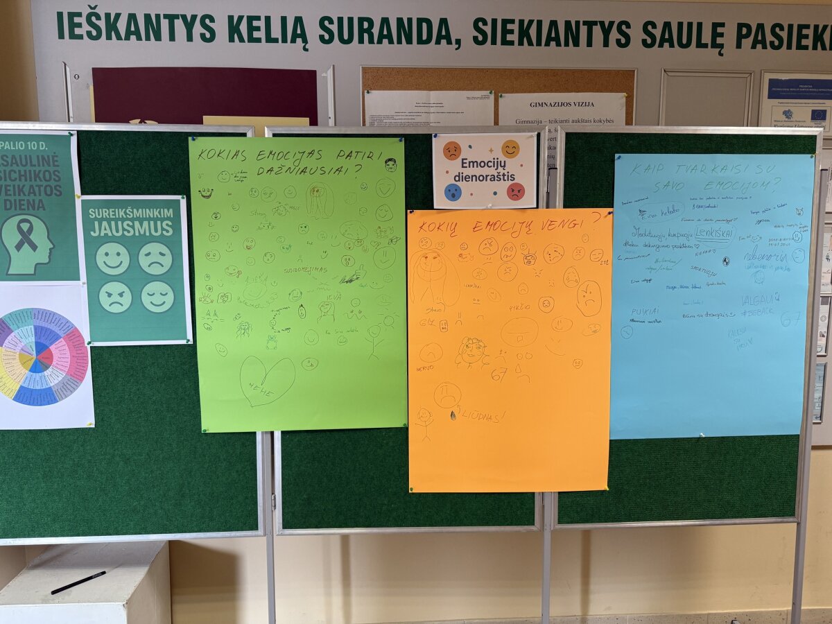 Pertraukų metu mokinių tarybos atstovės kvietė pildyti “Emocijų dienoraštį” ir pažymėti kokias emocijas patiriame dažniausiai