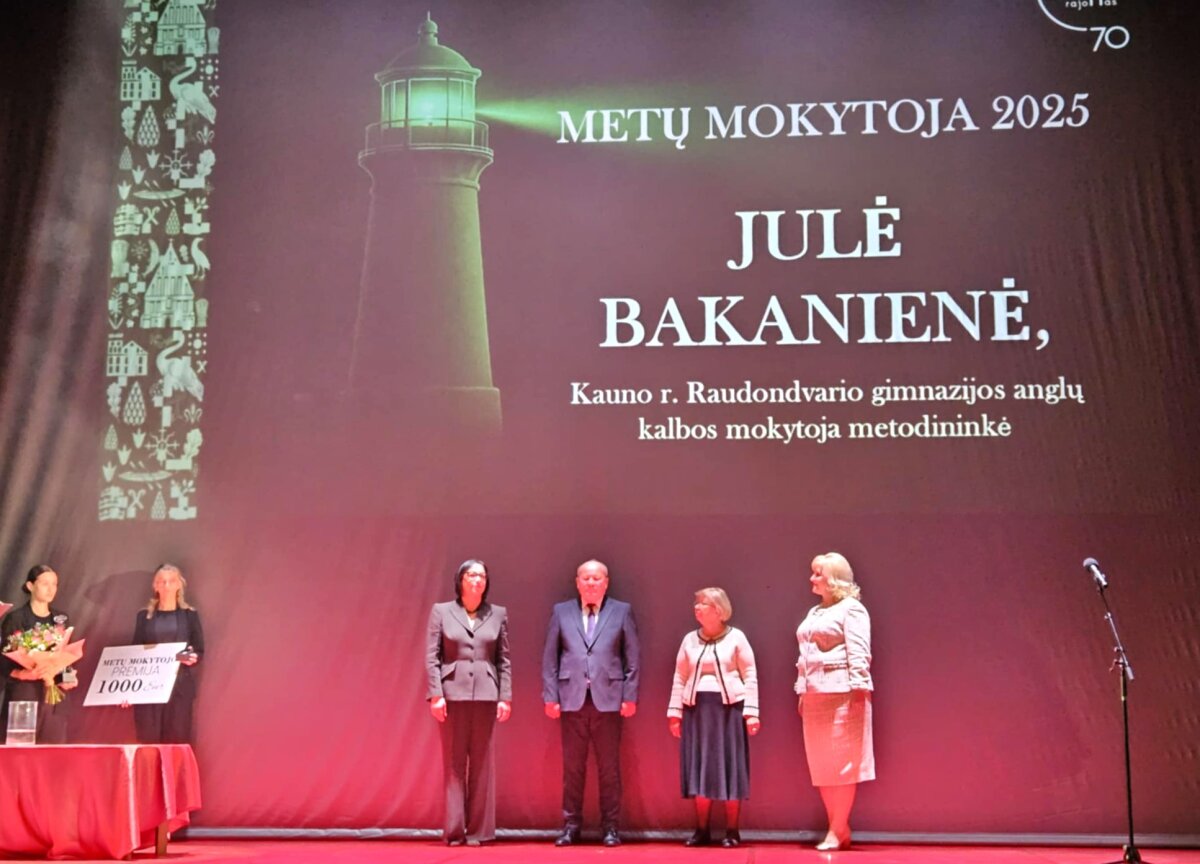 METŲ MOKYTOJOS nominacija buvo skirta ir įteikta ilgametei Raudondvario gimnazijos anglų kalbos mokytojai metodininkei Julei Bakanienei. Visą savo profesinį gyvenimą – net 46 metus –J. Bakanienė atidavė vienai mokyklai – Raudondvario gimnazijai – kurioje 20 metų ėjo ir direktoriaus pavaduotojos ugdymui pareigas, užugdė ne vieną kartą puikių, reikšmingų pasiekimų pasiekusių, mokinių.
