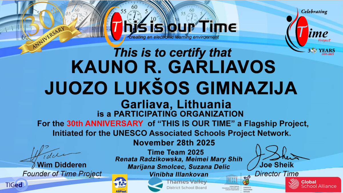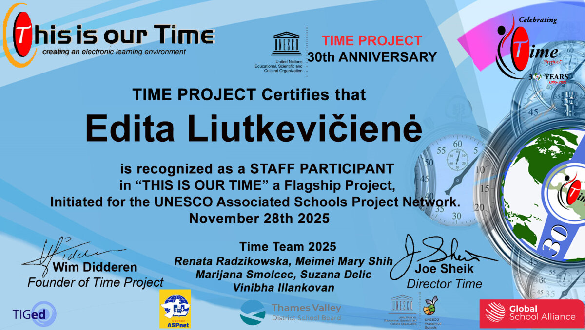 Džiaugiamės gautais pripažinimo dokumentais apie mūsų mokinių dalyvavimą tarptautiniame TIME projekte. Taip pat gautu kvietimu prisijungti kartu su gimnazijos mokiniais prie UNESCO Tarptautinės Švietimo dienos paminėjimo 2026 m sausio mėnesį bei įsitraukti į ta proga organizuojamas veiklas. Kiekviena tarptautinė patirtis mokiniams atneša vis naujų kompetencijų, kurios būtinos šiuolaikiniame pasaulyje norint išlikti konkurencingais.
