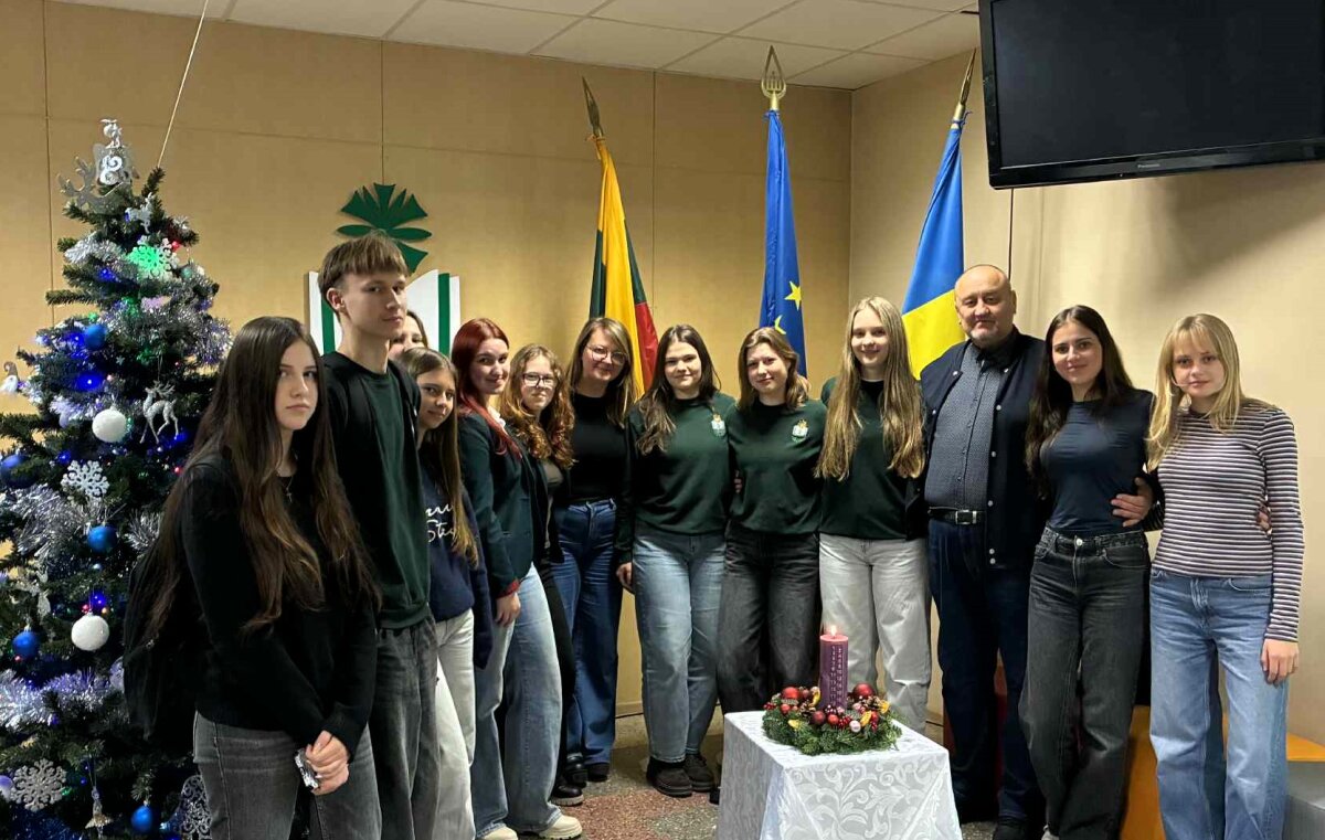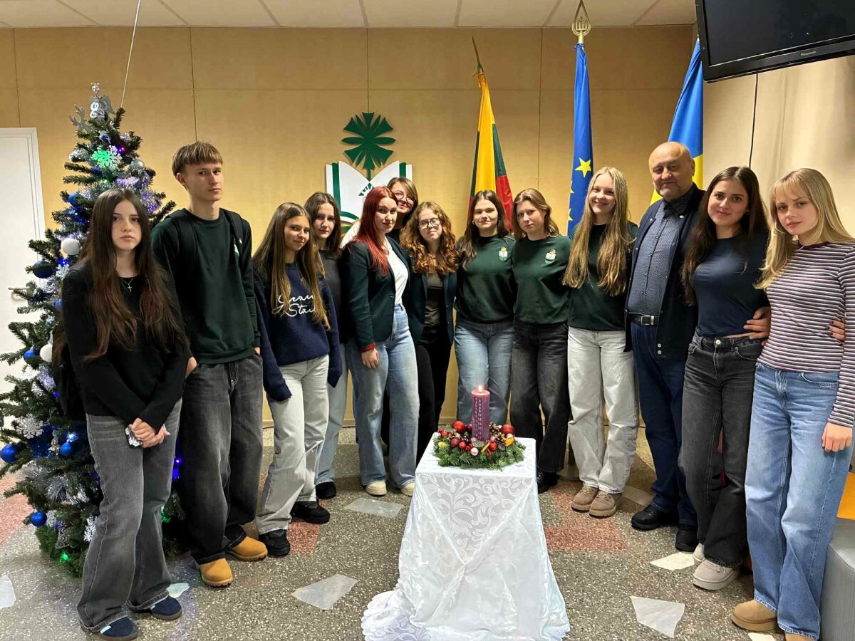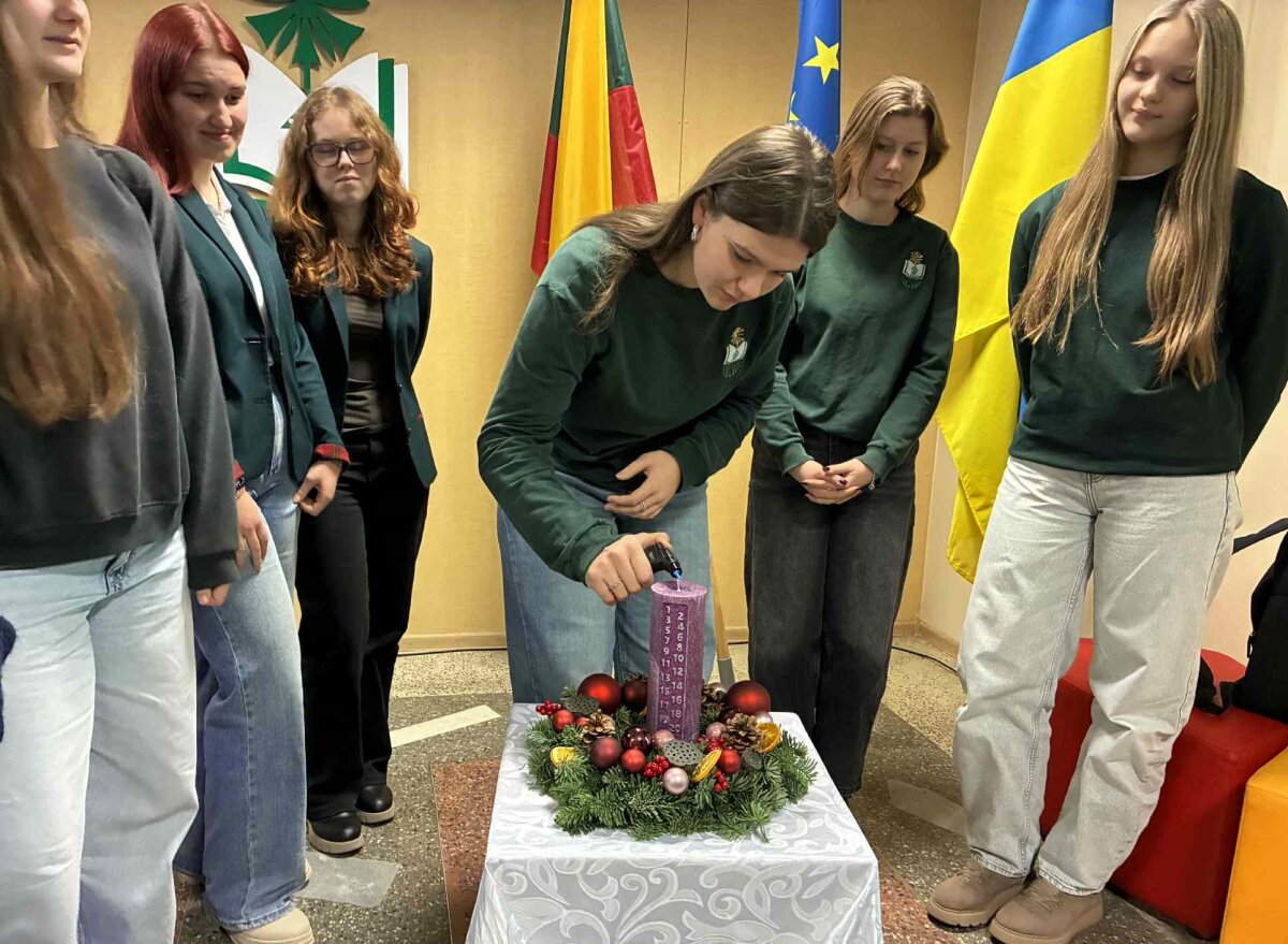 Šiandien apie tai mokiniams kalbėjo ir gimnazijos direktorius Vidmantas Vitkauskas, kuris gimnazijos bendruomenei padovanojo Advento vainiką ir drauge su mokinių taryba įžiebė Advento žvakę.
