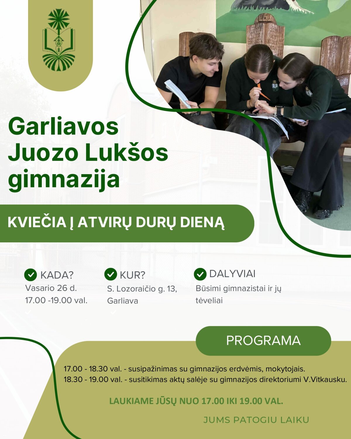 Vasario 26 d. (ketvirtadienį) nuo 17.00 iki 19.00 val. kviečiame į Atvirų durų dieną Garliavos Juozo Lukšos gimnazijoje.