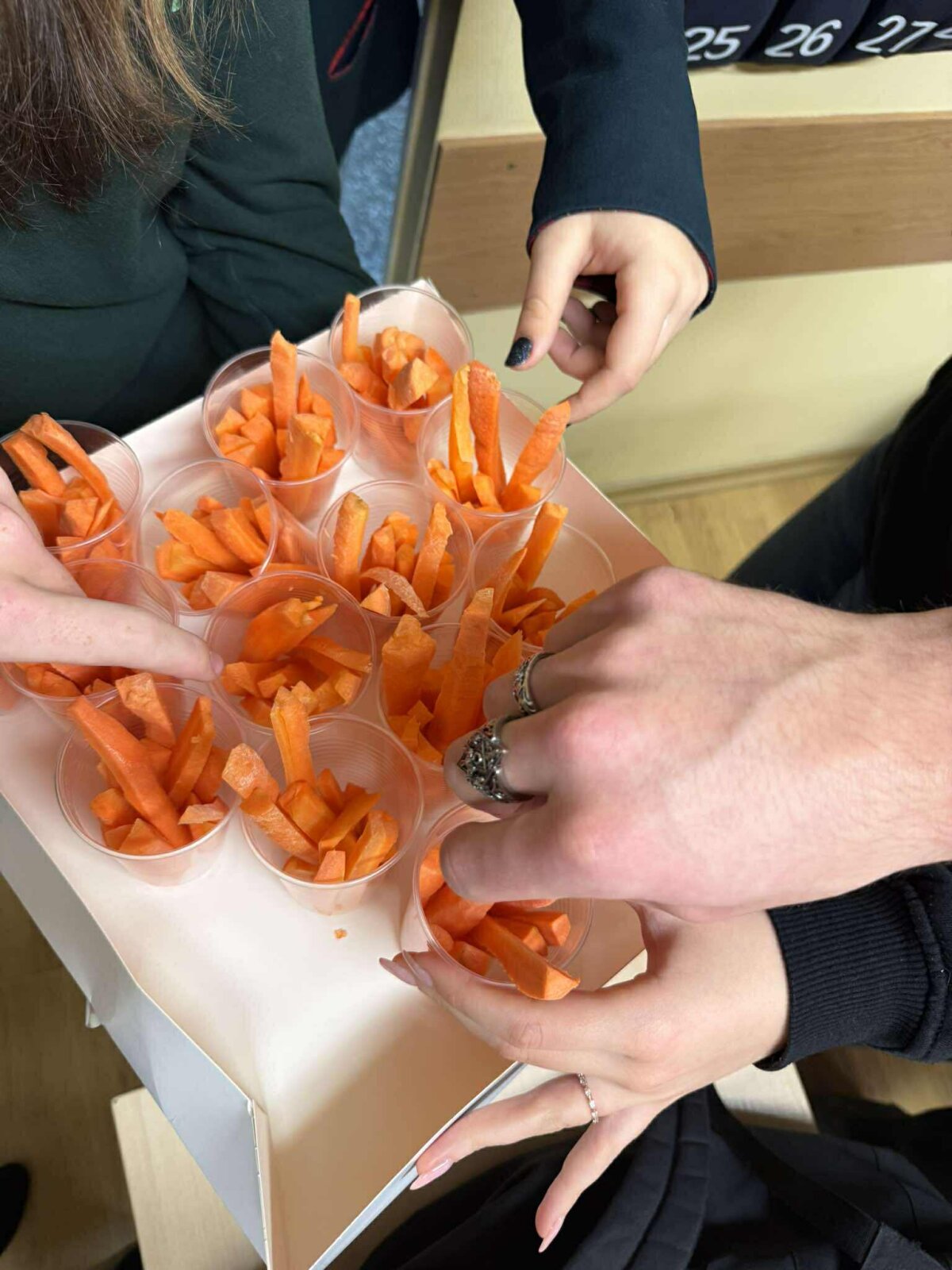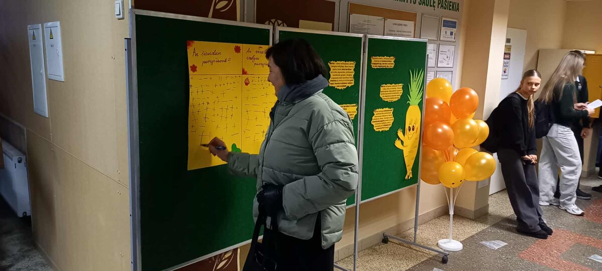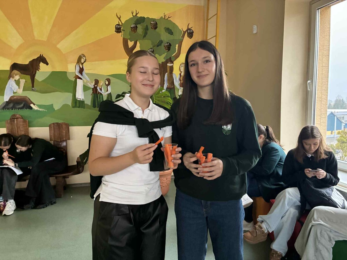 Dieną pradėjome nuo mitybos įpročių įsivertinimo, kalbėjomės apie sveikos mitybos svarbą ir sąmoningus pasirinkimus. Džiaugiamės Garliavos ūkininkų turgelio parama – gimnazijai padovanota net 20 kg ekologiškų morkų!