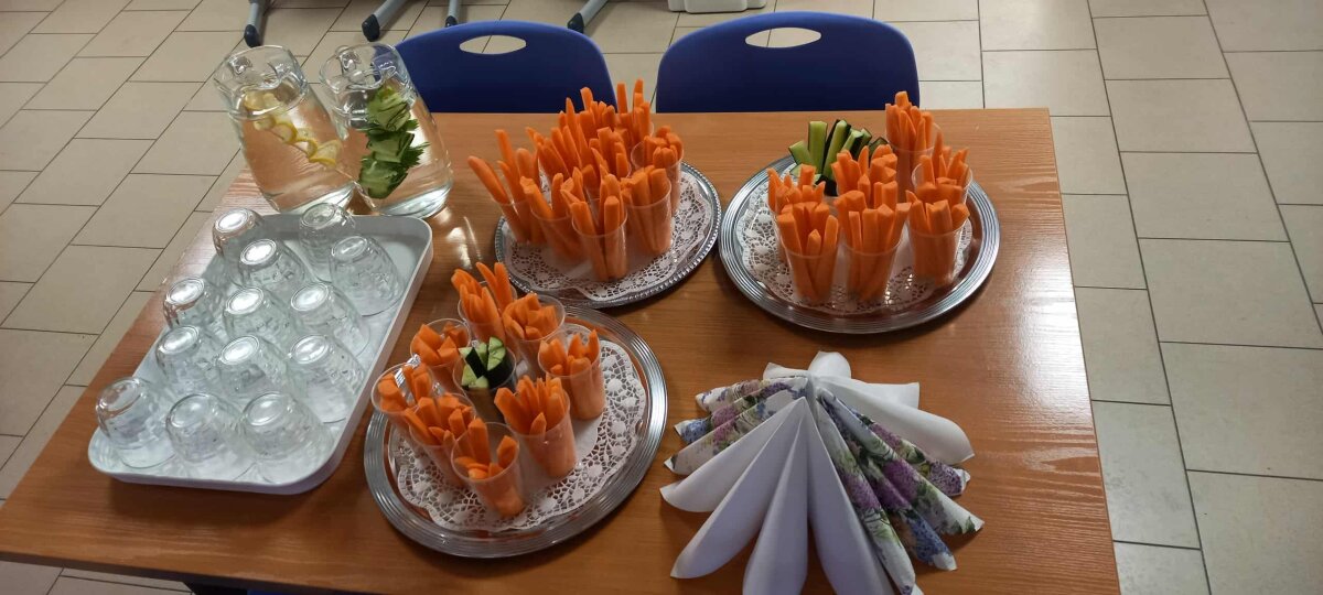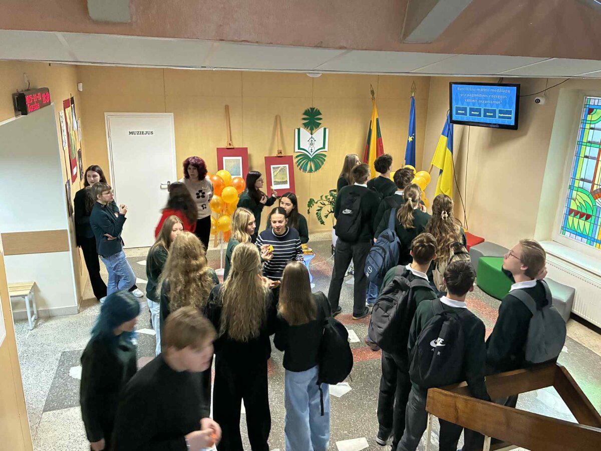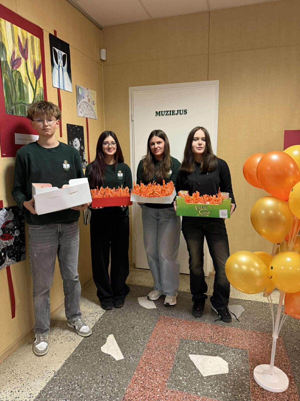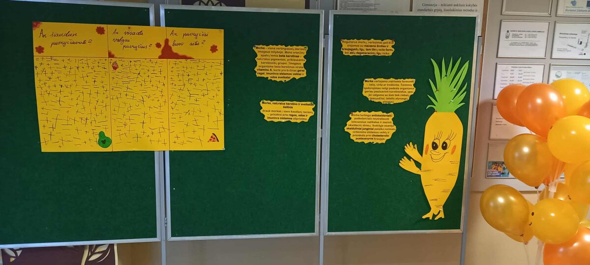 Iš jų gimnazistai su mokytoja Alina Vitkauskiene gamino morkų lazdeles ir gardžius morkų kepinius, o valgyklos virėjos paruošė sveikų užkandžių. Po trečios pamokos vyko „Laimės ratas“, kur mokiniai pasitikrino savo žinias apie mitybą ir laimėjo simbolinius prizus, įsteigtus Kauno r. VSB.