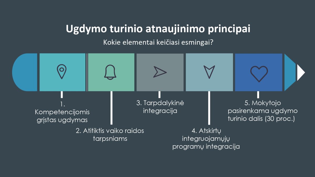 • Mokymosi turinys atnaujinamose programose pateikiamas išskiriant privalomą dalyko turinį (apie 70 procentų) ir pasirenkamą turinį (apie 30 procentų), kurį pasirenka mokytojas atsižvelgdamas į mokinių galimybes ir derindamas su kitais mokytojais. Šios proporcijos dydis gali skirtis priklausomai nuo ugdymo pakopos, dalyko logikos, tikslų, mokymo tradicijos.