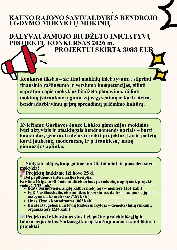Kviečiame Garliavos Juozo Lukšos gimnazija mokinius būti aktyviais ir atsakingais bendruomenės nariais – burti komandas, generuoti idėjas ir teikti projektus, kurie padėtų kurti jaukesnę, modernesnę ir patrauklesnę mūsų gimnazijos aplinką.